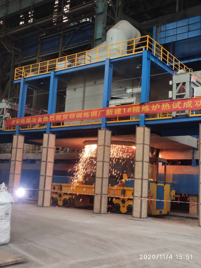 2020年11月4日,由西安桃園冶金承建的鄂鋼1# 130t-LF鋼包精煉爐一次性熱試取得圓滿成功。