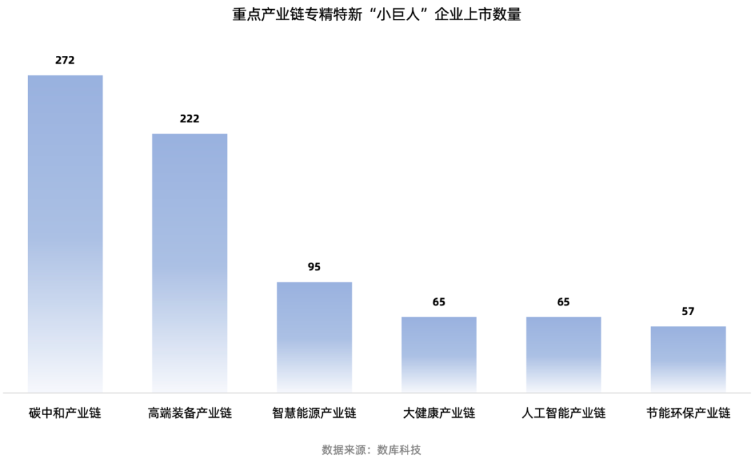 在上述產(chǎn)業(yè)鏈中,碳中和產(chǎn)業(yè)鏈中上市的專精特新“小巨人”企業(yè)數(shù)量最多,達(dá)到272家,占比30%;高端裝備產(chǎn)業(yè)鏈次之,上市222家,占比25%;智慧能源產(chǎn)業(yè)鏈上市95家,占比27%。