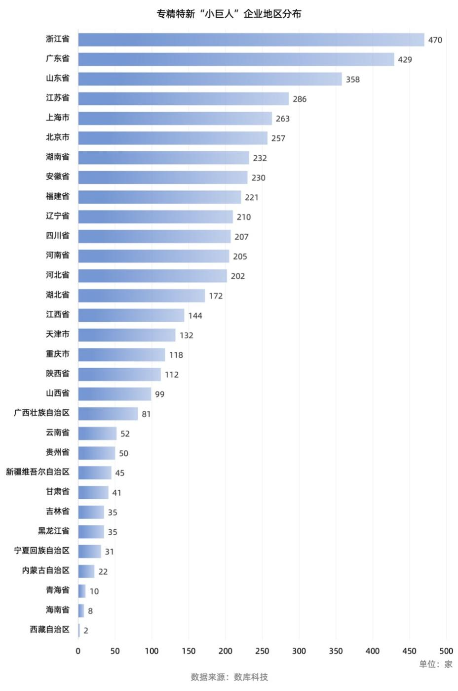 從地域上看,數(shù)庫科技數(shù)據(jù)顯示,入選國(guó)家工業(yè)和信息化部的專精特新“小巨人”企業(yè)主要分布在東部沿海地區(qū),其中浙江省470家,廣東省429家,山東省358家,江蘇省286家,上海市263家,位居前五。